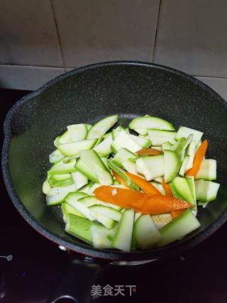 3. 加入玉瓜片和红椒条,快速翻炒均匀。